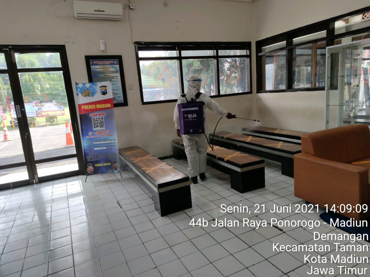 “Kegiatan penyemprotan disinfektan oleh anggota Polres Madiun ini rutin setiap hari dalam upaya memutus mata rantai penyebaran Covid-19,” kata Ari Senin (21/6/2021)