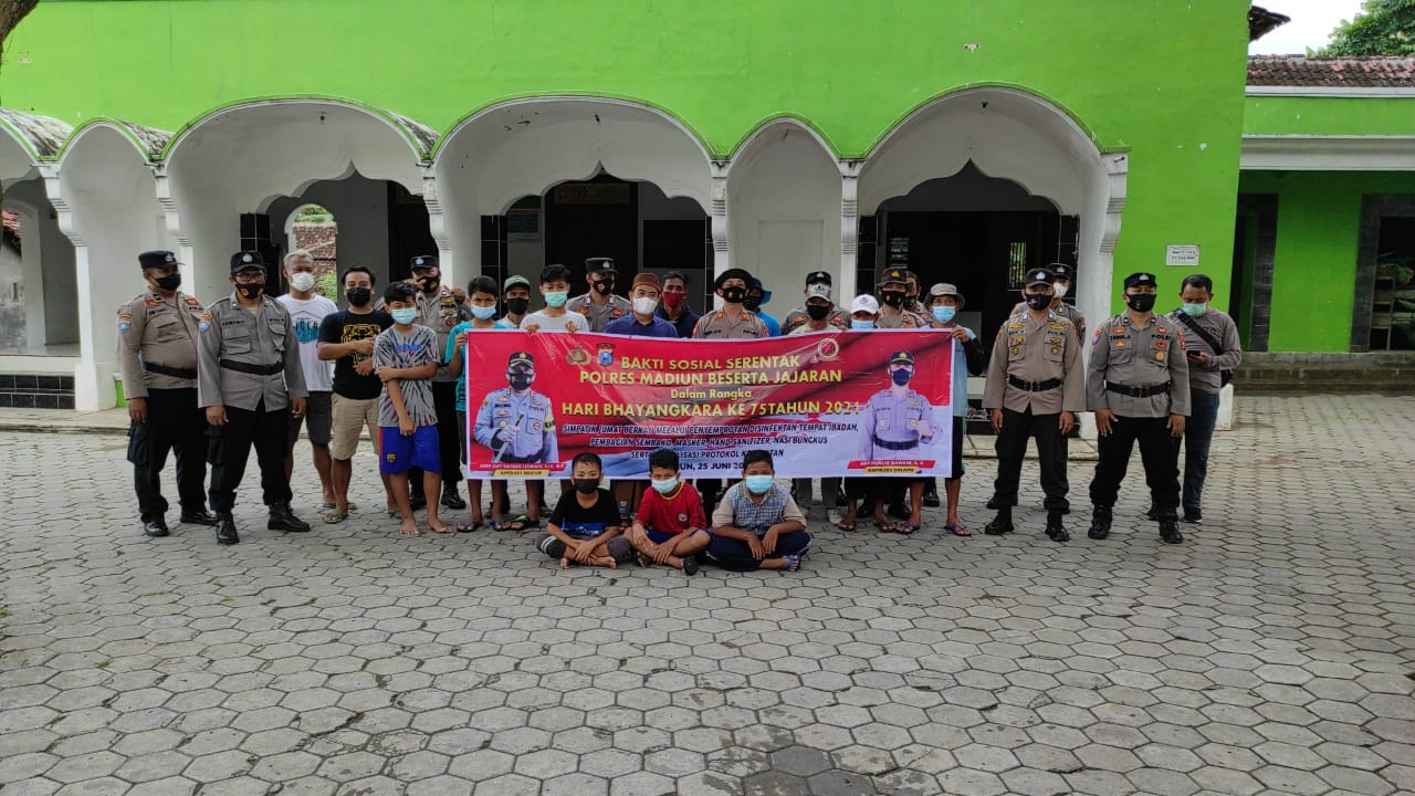 SeputarKita, Madiun – Dalam rangka menyambut HUT Bhayangkara ke-75, Polres Madiun menggelar Bakti Sosial serentak dengan membagikan sembako dan membersihkan tempat ibadah di wilayah Kabupaten Madiun.
