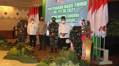 SeputarKita, Gresik – Pelaksanaan TNI Manunggal Membangun Desa (TMMD) ke – 111 Kodim 0817 Gresik resmi di tutup Bertempat di ruang Mandala Bhakti Praja lt IV kantor Pemkab Gresik dengan menerapkan protokol kesehatan yang sangat ketat, Rabu (14/07/2021).