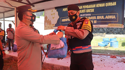 “Penyaluran daging Qurban ini bentuk kepedulian Polres Gresik terhadap masyarakat terdampak pandemi Covid-19.” tutur AKBP Arief Fitrianto.