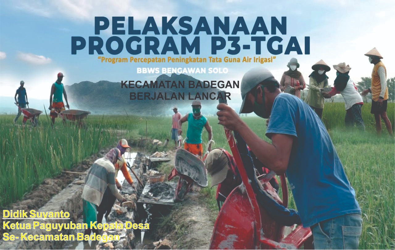 Ketua Paguyuban Kepala Desa Se- Kecamatan Badegan Didik Suyanto berterimakasih atas Program Percepatan Peningkatan Tata Guna Air Irigasi ( P3-TGAI) yang dicanangkan oleh Balai Besar Wilayah Sungai Bengawan Solo (DAS Solo,red) melalui Bidang Operasi dan Pemeliharaan Sumber Daya Air II, utamanya di Wilayah Kecamatan Badegan, Kabupaten Ponorogo berjalan dengan lancar dan sangat bermanfaat dan membantu terhadap para petani.