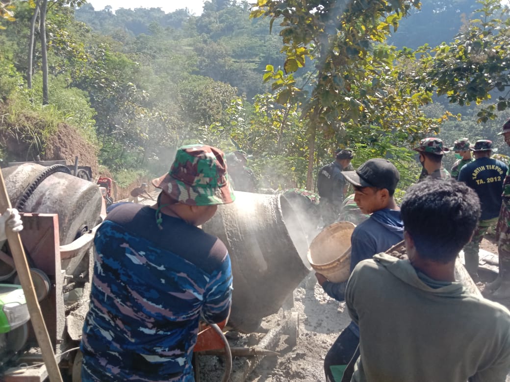 Pada sasaran pokok pengecoran jalan yang menghubungkan Dusun Templek menuju Dusun Biting, hari ini terlihat anggota satgas bersama masyarakat bahu membahu dan silih berganti membawa material untuk dijadikan adonan beton dan juga melangsir cor beton, untuk digelar pada jalan yang sudah dipasang bekisting cor. Kamis (01/07/2021)