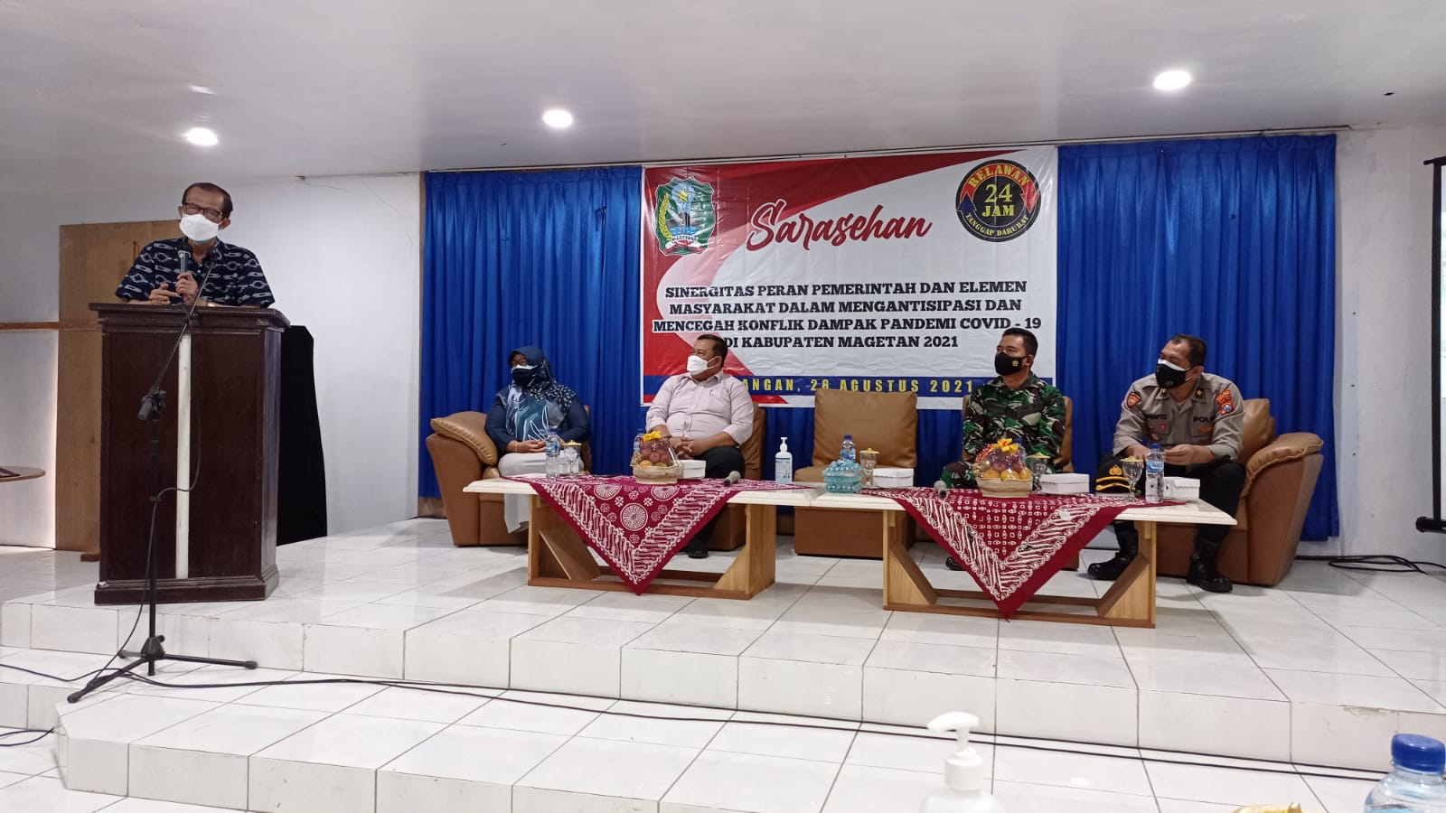 Bakesbangpol Kabupaten Magetan memfasilitasi Kegiatan Sarasehan Sinergitas Peran Pemerintah dan Elemen Masyarakat dalam Mengantisipasi dan Mencegah Konflik Dampak Pandemi Covid-19 di Kabupaten Magetan. Bekerjasama dengan Relawan 24 jam dan Relawan lainnya, digelar acara Sarasehan dengan Bupati Magetan bersama Forkopimda dan Kepala OPD terkait, bertempat di Aula Hotel Nusa Indah, Sarangan, Sabtu (28/08/2021).