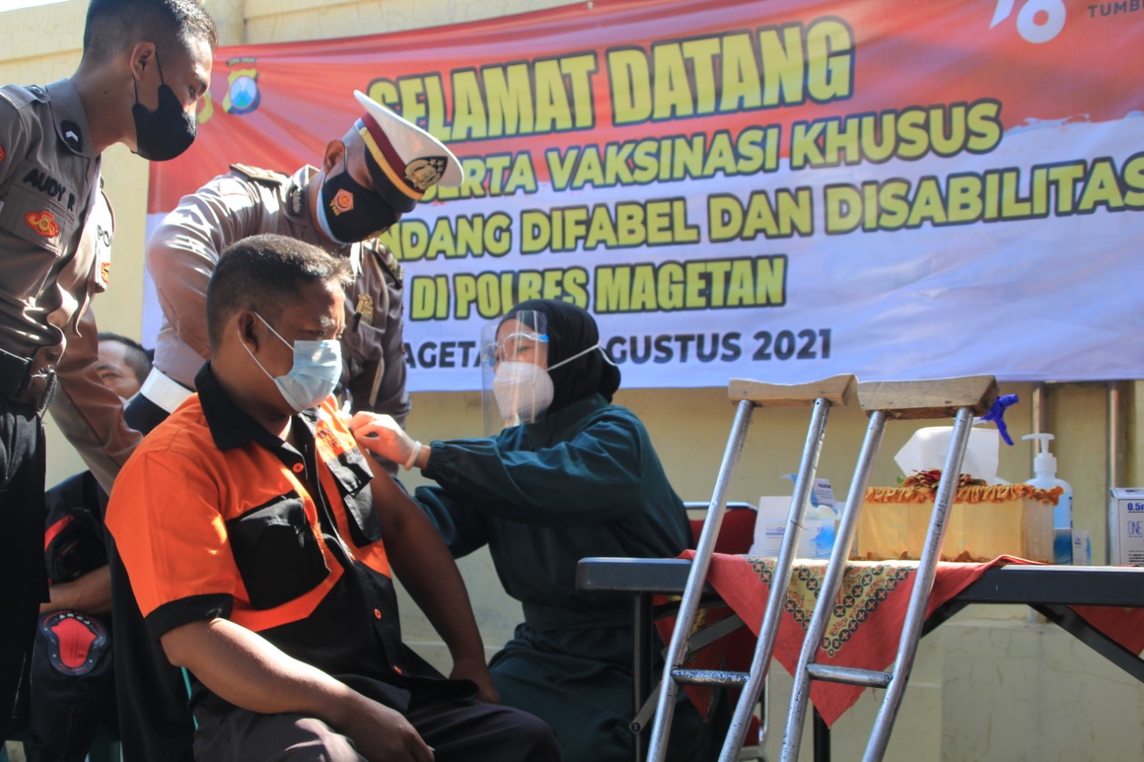 AKBP Yakhob Silvana Delareskha .SIK. MSi, Kapolres Magetan dihari pertama kali berdinas, meterangan vaksinasi terhadap para difabel dan disabiltas tersebut selain mendapatkan hak yang sama juga untuk mempercepat tercapainya herd imuniti kepada warga Magetan.