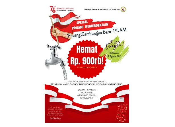 SeputarKita, Pemalang – Dalam rangka Hari Ulang Tahun ke-76 Kemerdekaan Republik Indonesia Tahun 2021 dan untuk meningkatkan cakupan pelayanan, Perumda Air Minum Tirta Mulia Kabupaten Pemalang menggelar Spesial Promo Kemerdekaan.