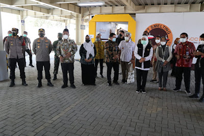 SeputarKita, Gresik – Kapolres Gresik AKBP Arief Fitrianto, SH, SIK, MM dampingi kunjungan Menteri Perindustrian RI Dr Agus Gumiwang Kartasasmita, M.Si dan Gubernur Jawa Timur Khofifah Indar Parawansa pada serbuan vaksinasi berbasis industri di PT Smelting, Desa Roomo, Kecamatan Manyar.