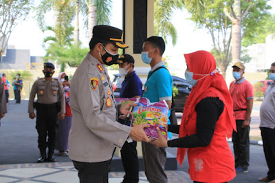 Kali ini ada sebanyak 1700 paket berisi beras @5kg. Paket secara simbolis diserahkan langsung oleh Kapolres AKBP Festo Ari Permana SIK kepada 3 orang perwakilan guru dihalaman mapolres.