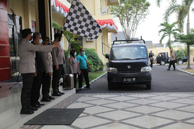 | Kapolres Magetan AKBP. Festo Ari Permana, SIK saat memberangkatkan bantuan beras untuk Guru Honorer |