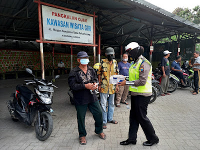 Seperti dilakukan dalam operasi Patuh kali ini (25/9/2021). Anggota Satlantas Polres Gresik menggelar sosialisasi protokol kesehatan kepada pengendara. di Terminal Bunder dan Terminal Ojek Giri Sekaligus membagikan stiker imbauan dan masker kesehatan gratis. ( sis / mz )