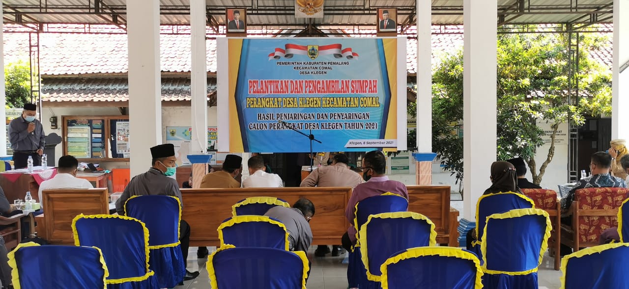 Bertempat di balai desa Klegen, acara Pengambilan Sumpah Janji dan Pelantikan Perangkat Desa Klegen dihadiri oleh Forkopimca Comal, BPD, LPMD, Tokoh masyarakat, kader PKK dan penggerak wanita serta Para tamu undangan dengan tetap mematuhi protokol kesehatan. Rabu, (8/9/2021).