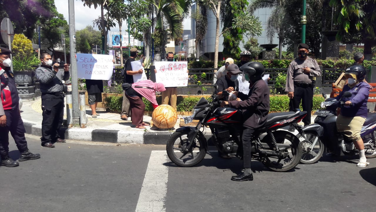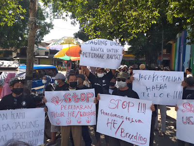 Puluhan peternak ayam petelur magetan yang dikoordinatori Surohman membentangkan spanduk yang bertuliskan, Pertahankan kemandirian peternak rakyat, Selamatkan peternak rakyat, Stop peredaran telur HE (Breeding), Jagung lokal hanya untuk peternak rakyat, Feed Mell menggunakan jagung import, Berikan kami harga jagung sesuai Permendag No.07 Tahun 2020, Jaga kestabilan harga telur, Intregator pembunuh rakyat.