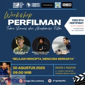 SeputarKita, Ngawi – Dunia perfilman mulai menjejak kuat di Kabupaten Ngawi. Komunitas Kacacekung bekerja sama dengan Jogja Film Academy (JFA) menggelar Workshop Perfilman: Temu Sineas dan Akademisi Film se-Ngawi Raya di SMAN 1 Ngawi, Sabtu (30/8/2025).