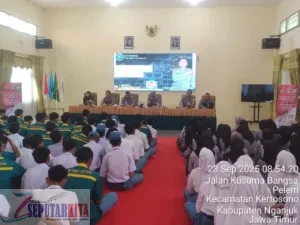 SeputarKita,Nganjuk,– Polres Nganjuk melalui Satuan Binmas menggelar kegiatan pembinaan dan penyuluhan tentang bahaya narkoba serta kenakalan remaja kepada para siswa SMKN 1 Kertosono, Selasa (23/9/2025). Acara ini diikuti sekitar 200 pelajar dengan didampingi guru serta mahasiswa magang dari UIN Diponegoro.