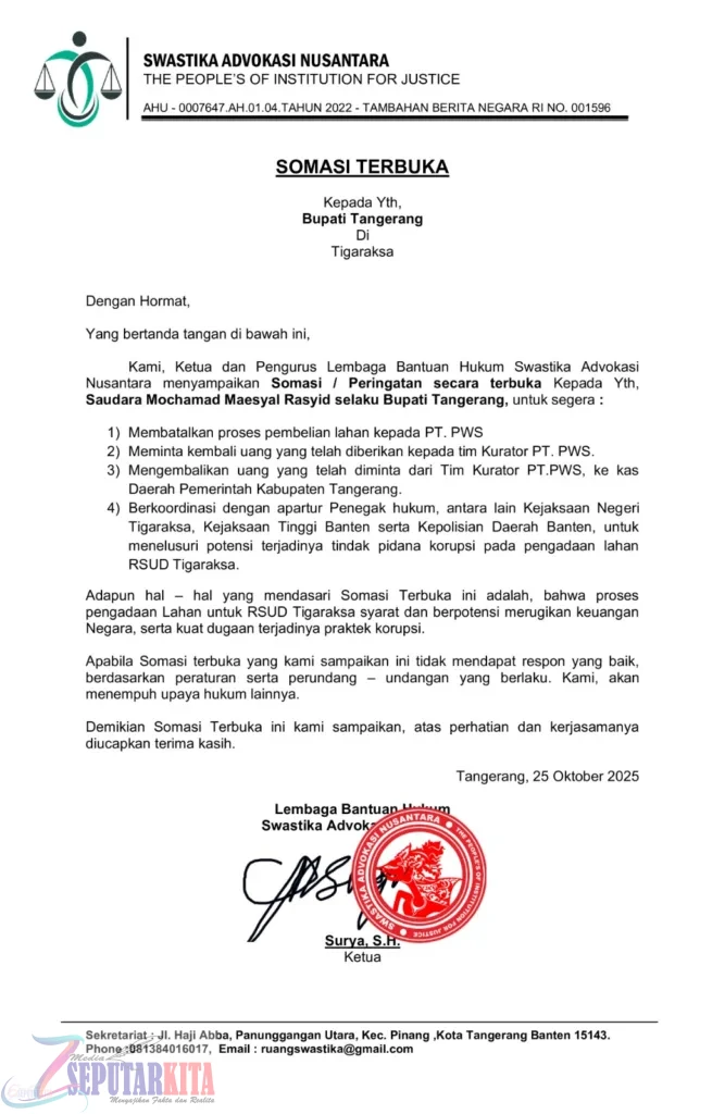 SeputarKita, Tangerang – Lembaga Bantuan Hukum Swastika Advokasi Nusantara (LBH SAN) Layangkan Somasi terbuka kepada Bupati Tangerang. Somasi yang dilayangkan LBH SAN kepada Bupati Tangerang, terkait pengadaan lahan untuk RSUD Tigaraksa, yang diduga berpotensi merugikan keuangan Negara. Melalui somasinya, LBH SAN meminta kepada Mochamad Maesyal Rasyid selaku Bupati Tangerang, untuk segera