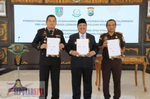 Seputarkita,JOMBANG – Pemerintah Kabupaten (Pemkab) Jombang bersama Kejaksaan Negeri (Kejari) Jombang dan Kepolisian Resor (Polres) Jombang resmi menandatangani Nota Kesepahaman (MoU) tentang Koordinasi Aparat Pengawas Internal Pemerintah (APIP) dan Aparat Penegak Hukum (APH) dalam Penanganan Laporan atau Pengaduan Penyelenggaraan Pemerintahan Daerah Kabupaten Jombang.