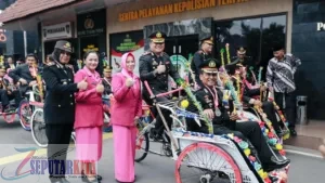 Seputarkita,Jombang – Tradisi Pedang Pora menjadi salah satu momen berkesan bagi Kapolres Jombang, AKBP Ardi Kurniawan, S.H., S.I.K., CPHR tercipta pada peringatan Hari Pahlawan 10 November 2025, dengan melaksanakan tradisi pelepasan yang penuh makna bagi anggota Polri yang memasuki masa pensiun. Dalam acara yang digelar di Halaman Polres Jombang, Kapolres memimpin langsung prosesi penghormatan kepada 27 anggota Polri yang purna tugas, dengan salah satunya mengayuh becak untuk mengantar mereka sebagai simbol penghargaan.