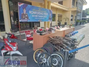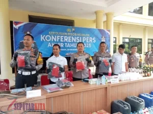 SeputarKita,Nganjuk,– Polres Nganjuk menggelar konferensi pers akhir tahun untuk memaparkan capaian kinerja dan situasi kamtibmas sepanjang 2024 hingga 2025. Kegiatan dipimpin langsung Kapolres Nganjuk AKBP Henri Noveri Santoso, S.H., S.I.K., M.M., didampingi Kasat Reskrim, Kasat Resnarkoba, Kasat Samapta, Kasat Lantas, serta Kasi Humas Polres Nganjuk, Senin (29/12/2025).
