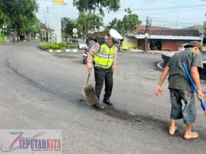 SeputarKita,Nganjuk,- Program Polantas Menyapa kembali menunjukkan kehadiran polisi di tengah masyarakat melalui aksi cepat personel Satlantas Polres Nganjuk yang bersama warga melakukan pembersihan tumpahan minyak di Bundaran Tugu Adipura, Jalan Gatot Subroto, Kamis (11/12/2025).