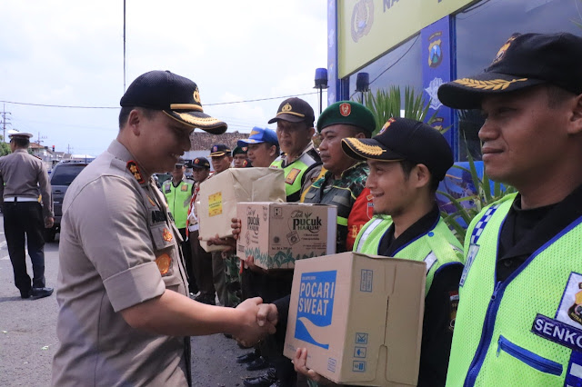 Kapolres Ponorogo AKBP Arief Budiman memberikan bingkisan kepada personel yang bertugas di pos pelayanan di depan masjid agung alun-alun Ponorogo